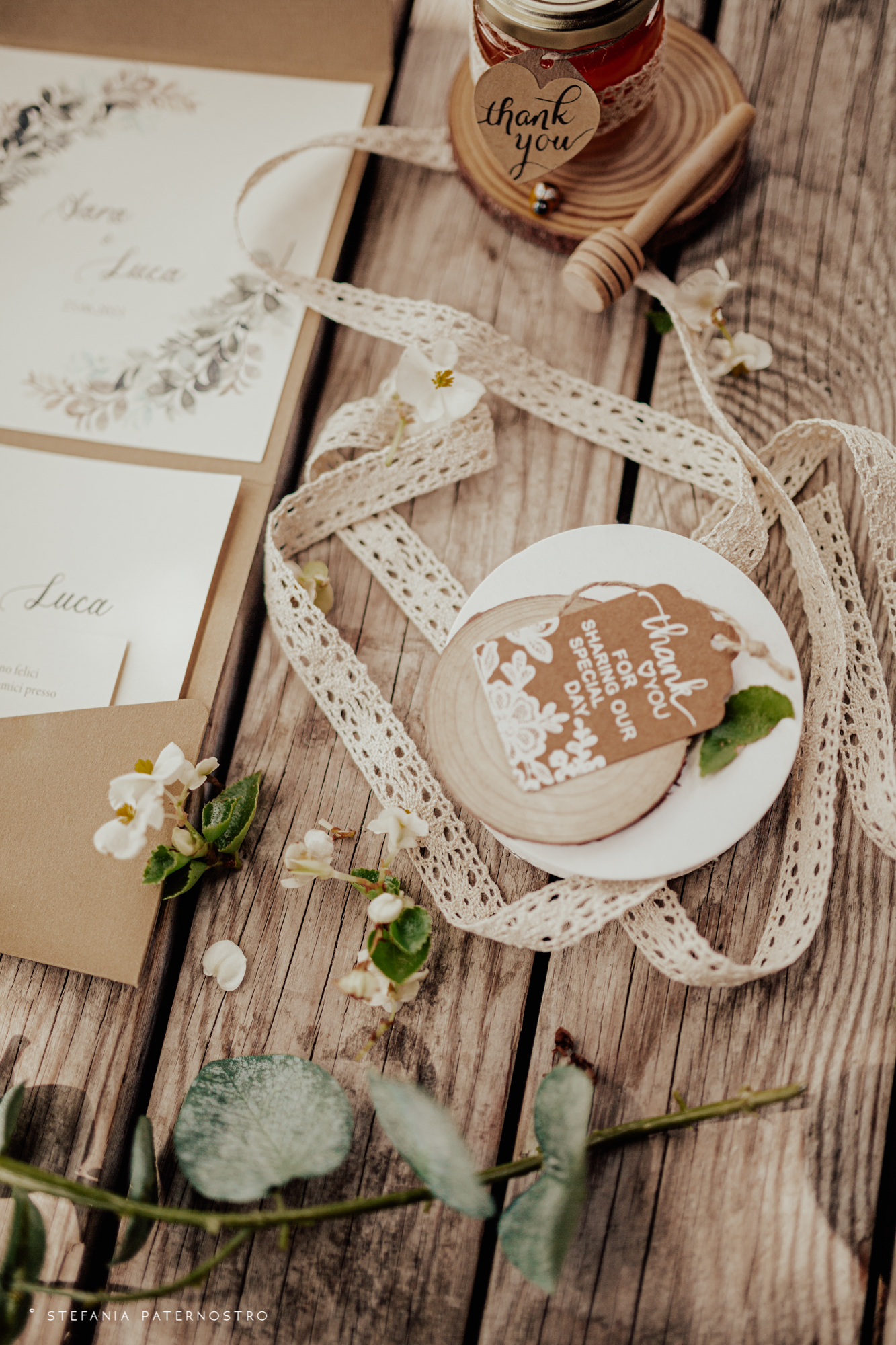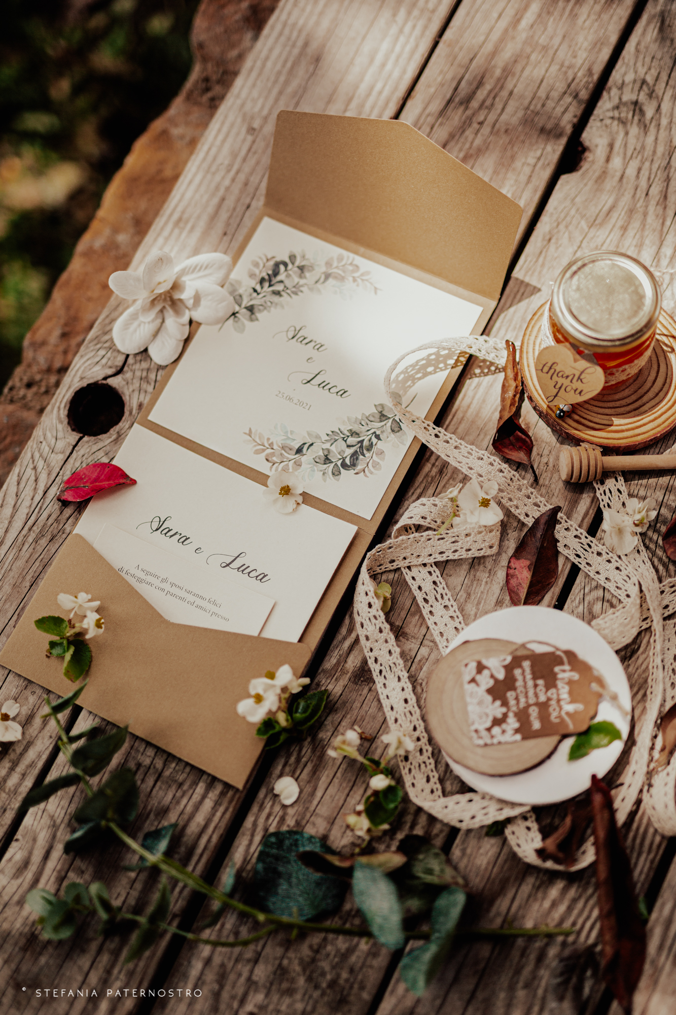 Spesso gli sposi ci tengono a far esaltare il tema nei piccoli dettagli e per questo noi abbiamo pensato di proporvi anche queste chicche, che vanno a definire meglio un progetto ben pensato e personalizzato. La suite grafica del Natural Wood l’abbiamo immaginata in carta kraft e carta martellata con elementi grafici minimal. Per abbracciare a 360° l’amore per la natura, l’ecosostenibilità e l’idea della bomboniera utile, proponiamo sempre ai nostri sposi di ringraziare i loro ospiti con gadgets o bomboniere ecofriendly: miele e liquori artigianali, piantine, marmellatine bio a km zero, sono solo alcuni esempi delle tendenze 2022.